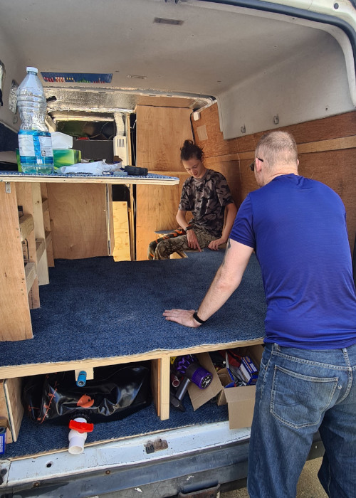 The conversion began. First, I had to empty the entire van and clean and scrub it. Any missing paint got sprayed and tidied up. Then we insulated it with used yoga matts (free!) and insulation left over from a house build (cheap!). We got wood for free on Marketplace. We bought screws and little bits. The place we were staying at luckily had lots of tools, and whatever they didn’t have we borrowed from friends in the local yard. Thanks Dan. Mum helped me find so many things we needed and drove around collecting them. Dad helped me with the building and the bigger tools so I didn’t lose a finger. Mum made me wear goggles basically all the time.